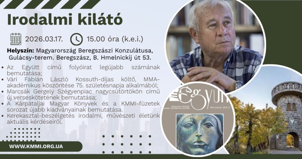 Irodalmi kilátó című hagyományos rendezvényét tartja az Együtt folyóirat és a Kárpátaljai Magyar Művelődési Intézet március 17-én Beregszászban. A programról Dupka György, az irodalmi-kulturális lap felelős kiadója közölt részleteket a Facebookon.