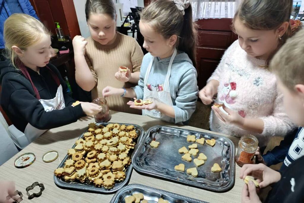 A tájházi sétát követően beszélgetés kezdődött az adventhez kapcsolódó szokásokról és az ünnep jelentéséről. A tanulók több hagyományt maguk is felidéztek, majd két csoportban folytatták a foglalkozást. Az egyik csoport a konyhába vonult, ahol Piroska néni, a tájház szakácsnője segítségével linzerkarikákat készítettek. A gyerekek saját kezűleg szaggatták a tésztát, majd a frissen kisült süteményeket lekvárral ragasztották össze.