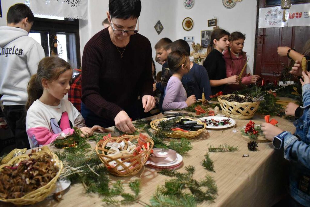 Ezzel párhuzamosan a foglalkoztató teremben Kepics Andrea, a tájház kézműves szakembere vezetésével ünnepi asztaldíszek készültek. A diákok viaszlapokból gyertyát sodortak, majd egy fakorongra helyezték, mely az asztaldísz alapja lett. Fenyőágakkal rakták körbe és dekorálták. A díszítés során természetes alapanyagok – tobozok, bogyók, termések – mellett szalagok és csengők közül is választhattak. A program végére mindenki elkészítette saját, egyedi adventi kompozícióját, amelyek jól tükrözték a gyerekek különböző ízlésvilágát.