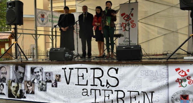 Faágakkal játszadozó szél, borús égbolt, nyíló esernyők, zápor. Ez a látvány tárult azok elé, akik részt vettek a Vers a téren elnevezésű rendezvényen, amelyet harmadik alkalommal szervezett meg a Pro Cultura Subcarpathica (PCS) civil szervezet a magyar költészet napján, április 11-én. A helyszín – az előző két évhez hasonlóan – Beregszász főtere volt. A résztvevők közt Kárpátalja különböző szegleteiből érkező tanárokkal, diákokkal találkozhattunk, körülbelül harminc magyar tannyelvű iskola képviseltette magát kisebb-nagyobb csoportokkal a rendezvényen. Tekintettel az Arany János-emlékévre, a költő Enyhülés című versét szavalták el a jelenlévők.