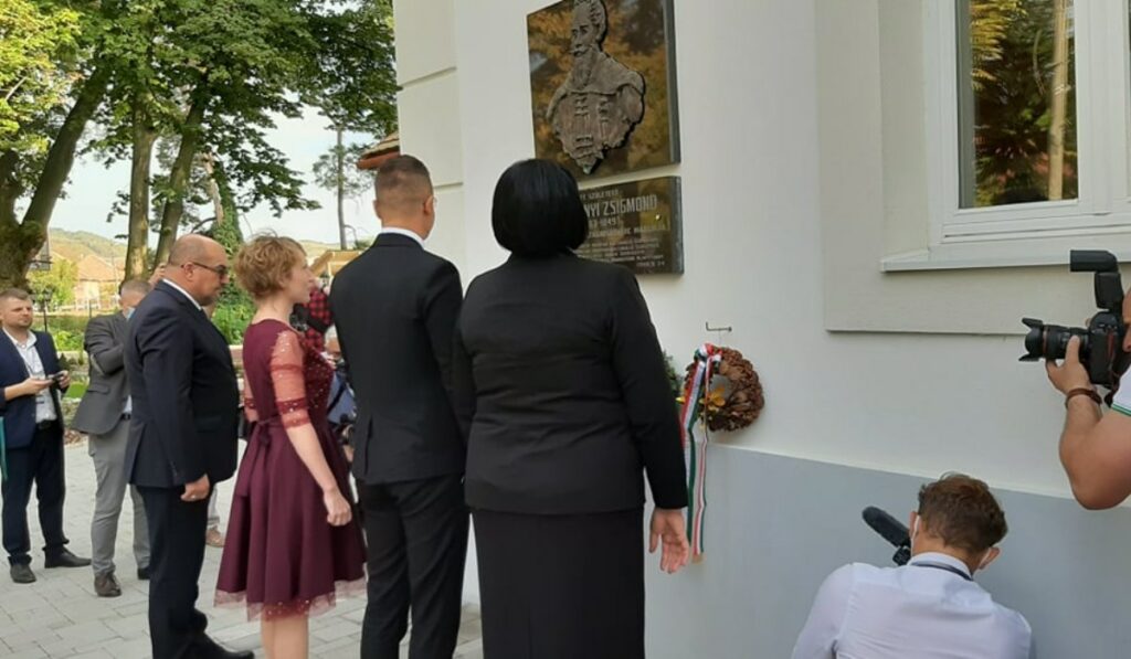 Az épület történetének ismertetése után Szijjártó Péter külügyminiszter, Brenzovics László, a Kárpátaljai Magyar Kulturális Szövetség elnöke, Orosz Ildikó, a Rákóczi-főiskola elnöke és Pallagi Marianna, a PCS igazgatója elhelyezték az emlékezés koszorúit báró Perényi Zsigmond emléktáblájánál.