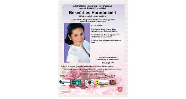 A Kárpátaljai Rózsahölgyek Társasága Békéért és harmóniáért címmel jótékonysági zenés estet szervez 2015. április 29-én Beregszászban. A II. Rákóczi Ferenc Kárpátaljai Magyar Főiskola Esztergom termében este 17 órakor kezdődő rendezvényen fellép Pitti Katalin Liszt Ferenc-díjas operaénekesnő, érdemes művész, aki egyben a koncert fővédnöke, Radics Sándor Európa-díjas cimbalmos, zenekarvezető, valamint a Beregszászi Művészeti Iskola tanári kara. A koncert díszvendége dr. Orosz Ildikó, a Rákóczi-főiskola elnök asszonya.