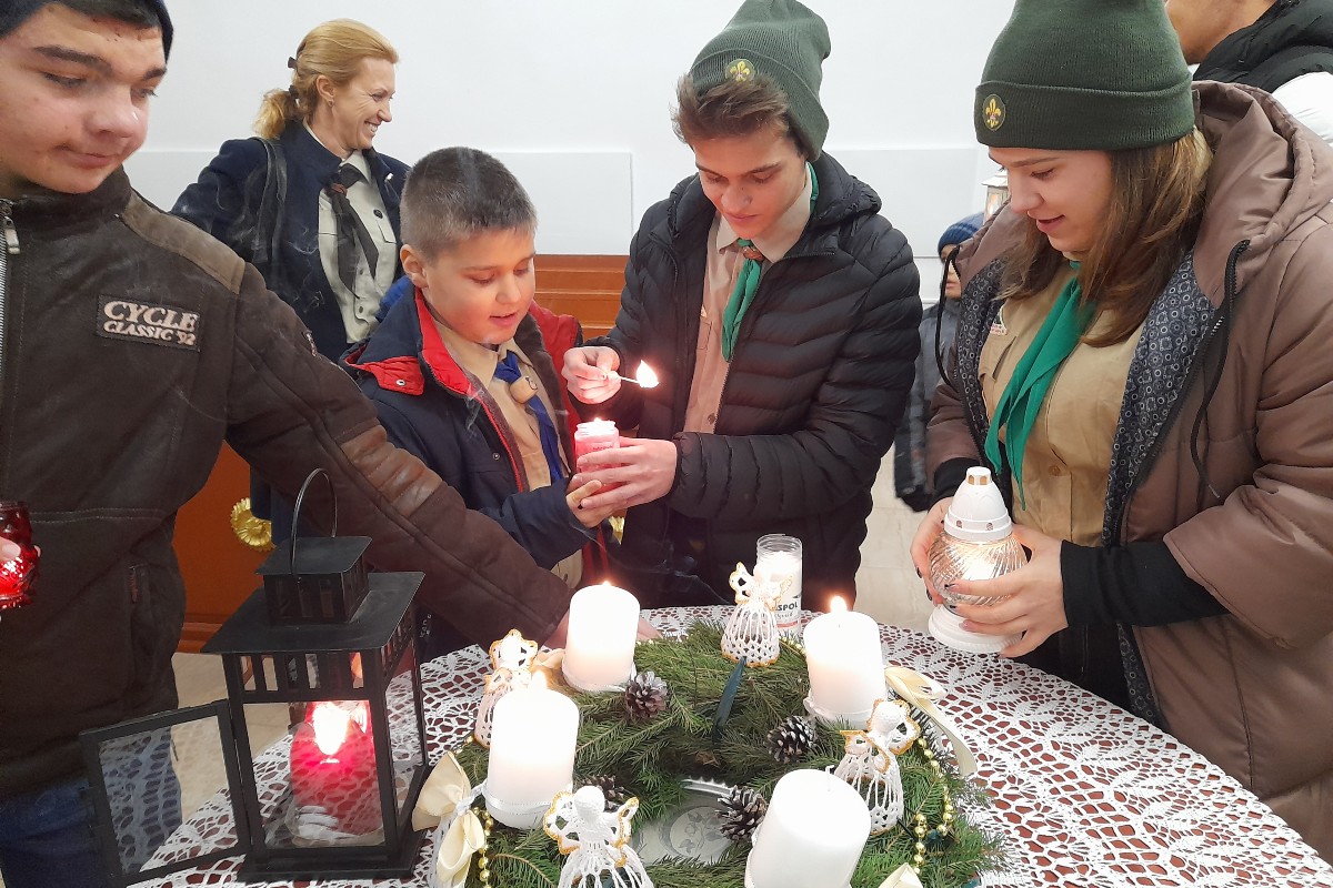 A Kárpátaljai Magyar Cserkészszövetség idén Mezőkaszonyban szervezte meg a betlehemi békeláng fogadásának és átadásának megyei központi ünnepségét, melynek a helyi református templom adott otthont december 18-án.