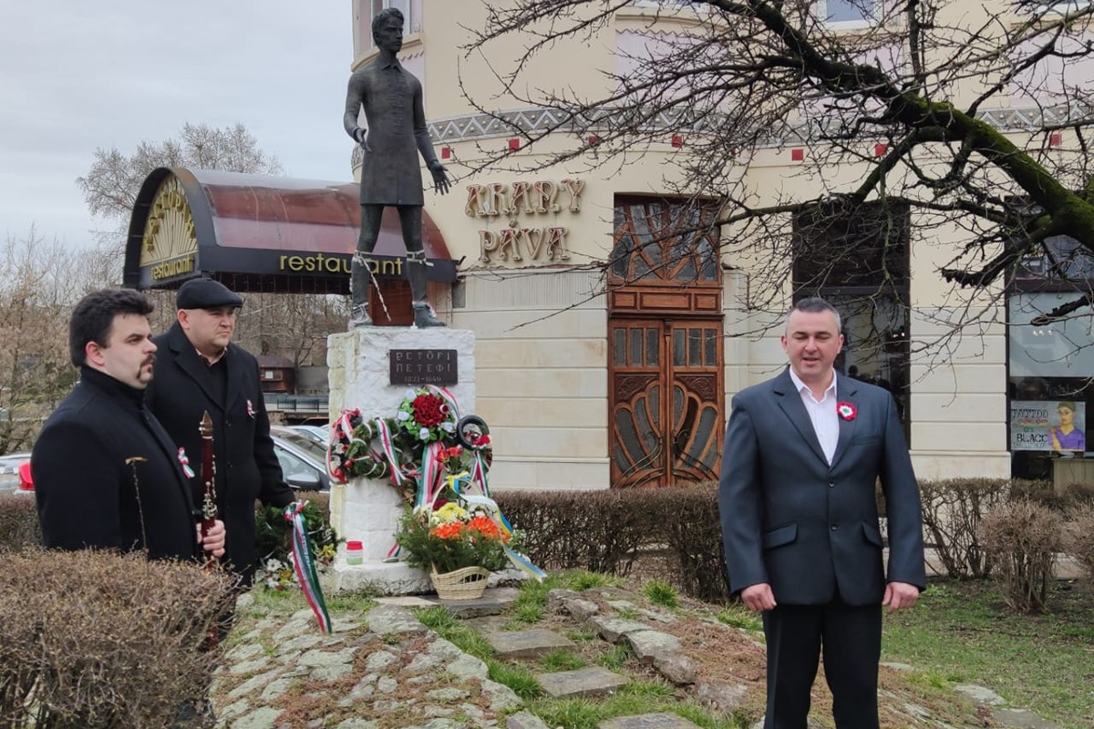A megemlékezők elsőként megkoszorúzták a főiskola külső falán lévő Kossuth-emléktáblát, majd a Kárpátaljai Megyei Magyar Drámai Színház épületének falát díszítő Petőfi-emléktáblát. A szervezetek ezt követően Petőfi Sándor szobra előtt hajtottak fejet.