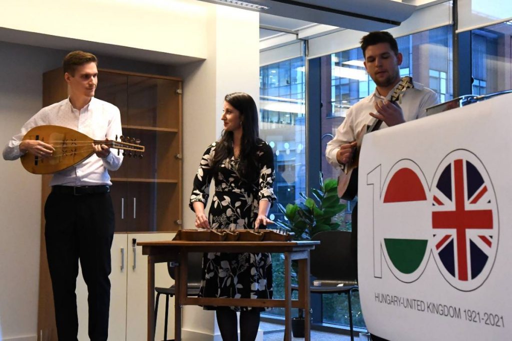 A magyar jelenlét emellett idén különösen nagy jelentőségű volt a szigetországban, hiszen 2021-ben ünnepeljük a két ország közötti diplomáciai kapcsolatok felvételének századik évfordulóját is. Ebből az alkalomból további eseményeken is részt vettek a Hagyományok Háza együttesei és szakmai delegációja: október 21-én a Manchesteri Magyar Főkonzulátus ünnepi fogadásán a Pengetős trió adott koncertet, 23-án pedig táncházat tartottak a Muzsikás együttes közreműködésével a magyar diaszpóra részére. A jeles eseményen bemutatták Simon Broughton és Weyer Balázs Repülj, madár, repülj című, a táncházmozgalom történetét feldolgozó dokumentumfilmjét is.