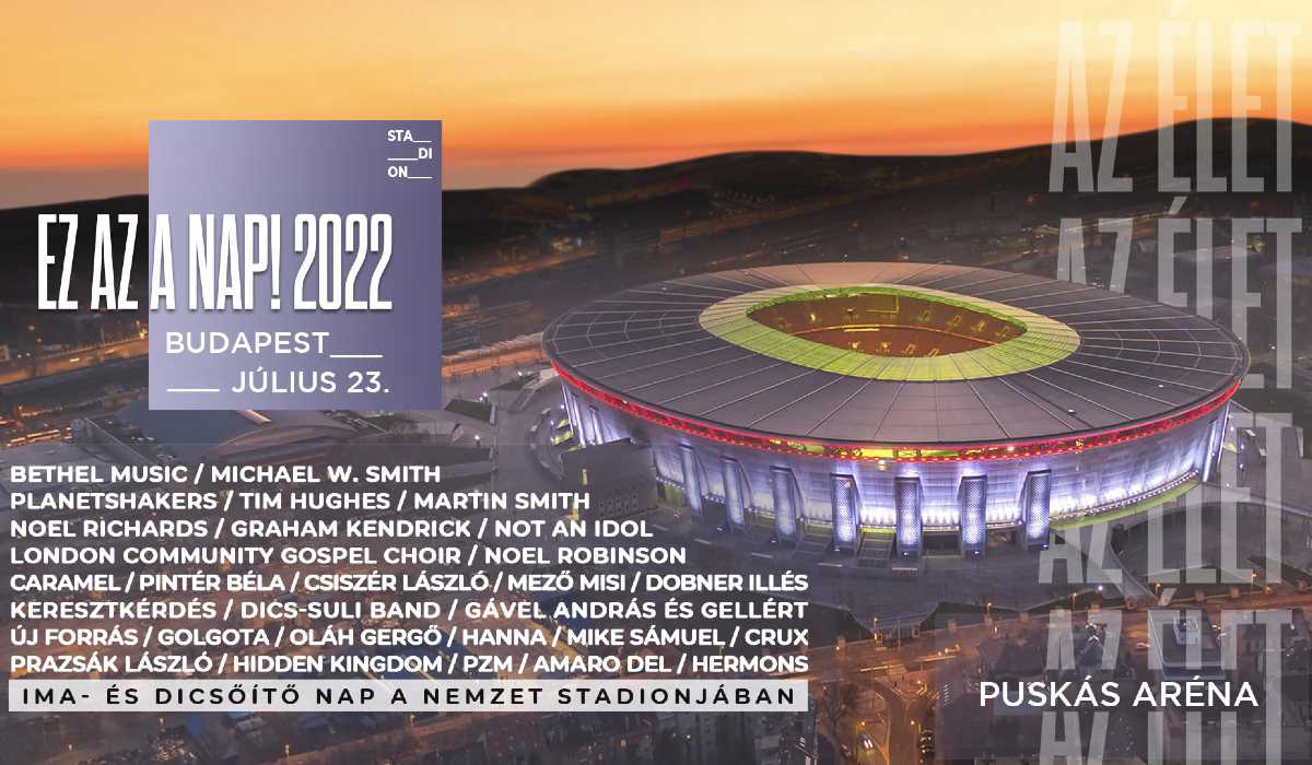 Július 23-án az Ez az a nap! című rendezvényre a Puskás Arénába várják a kortárs keresztény könnyűzene világsztárjait és a műfaj hazai képviselőit; az esemény kiemelt vendége lesz a Bethel Music és Michael W. Smith az Egyesült Államokból, valamint a Planetshakers Ausztráliából, emellett színpadra lép többek között Pintér Béla, Caramel és Mező Misi – közölték a szervezők az MTI-vel.