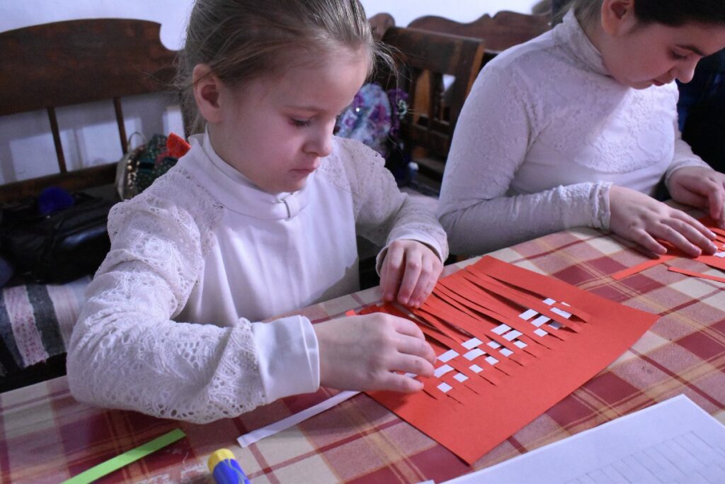 A továbbiakban az alkotásé volt a főszerep. A kézművesség során elsőként a szövés alapjait tanulták meg Furman Éva vezetésével. A fiatal korosztályhoz alkalmazkodva papíron szőttek a gyerekek. A cél a rozmaringágas beregi motívum elkészítése volt.