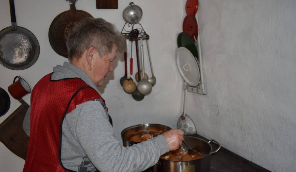 Ez idő alatt a konyhában szalagos fánk készült. A jellegzetes farsangi ételt közösen fogyasztották a mulatság végén.