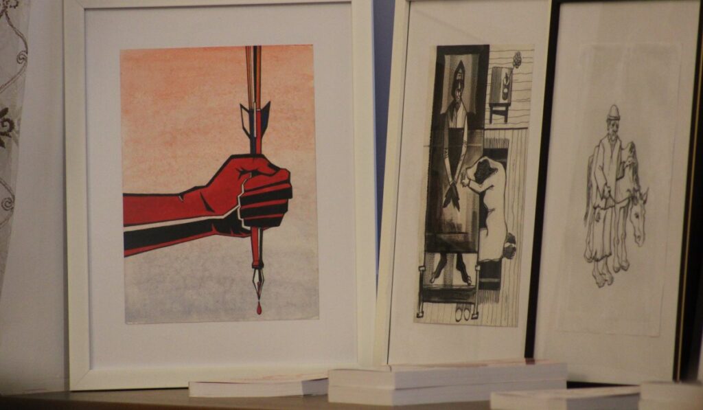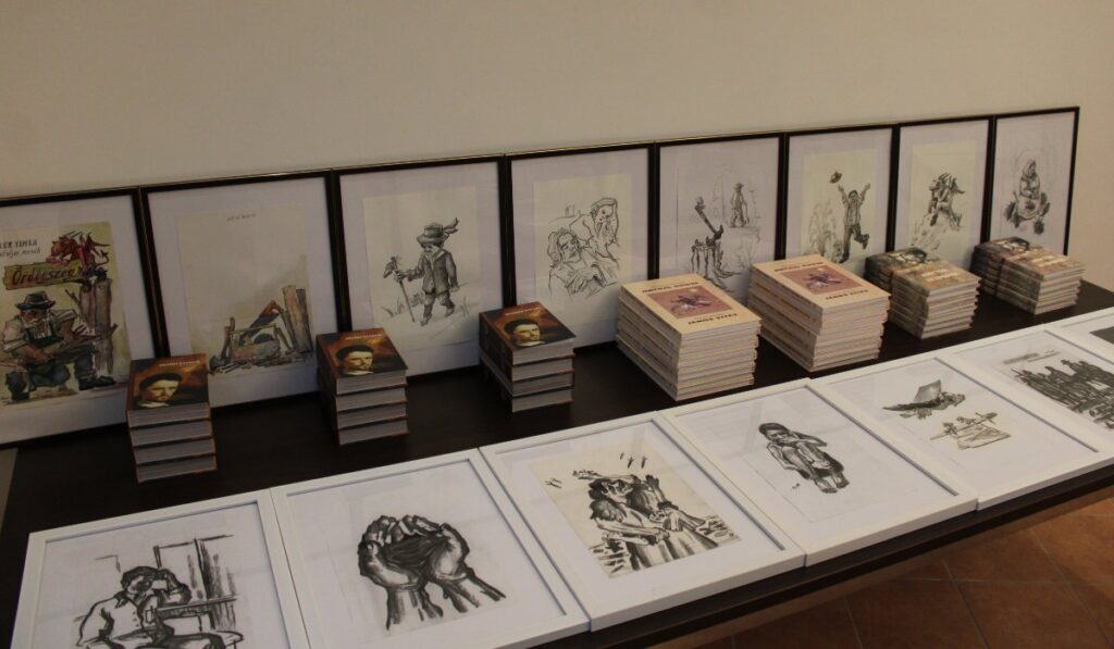 Dupka György, a MÉKK és a KMMI elnöke, az Intermix kiadó felelős kiadója bemutatta Kutasi Csaba tiszapéterfalvai festőt, grafikust, aki az Ördögszeg és a Szégyenpiac kiadványokat illusztrálta. Elmondta, hogy a teremben 21 tabló alakjában mutatták be a könyvillusztrációkat.