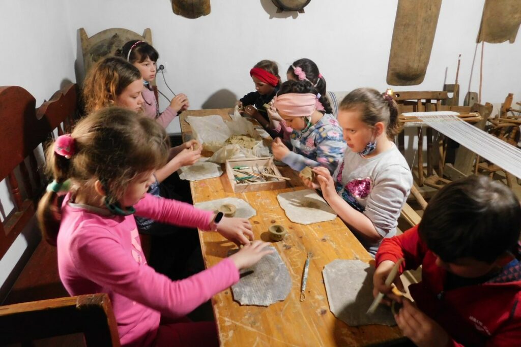 A program további részében az agyag és a filc megmunkálásával ismerkedtek meg. Az agyag olyan természetes anyag, ami egyrészt tele van ásványi anyagokkal, másrészt puhasága miatt könnyen formálható, így alkalmat ad a kreativitás és a kézügyesség fejlesztésére. A tájházban ifj. Hidi Endre szobrászművész vezetésével próbálhatták ki a korongon való munkát, az agyag formázási lehetőségeit. A gyerekek hosszú munkával szebbnél szebb tárgyakat alkottak.