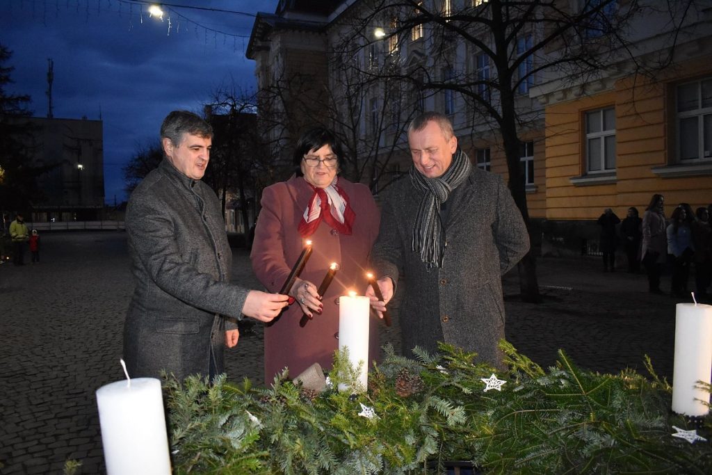 Az ünnepi köszöntők után Orosz Ildikó, a PCS és a Rákóczi-főiskola elnöke, Csernicskó István rektor és Babják Zoltán polgármester közösen gyújtották meg a várakozás első gyertyáját.
