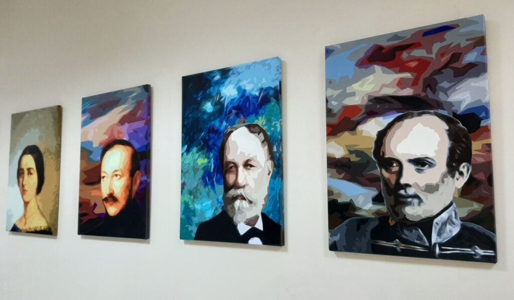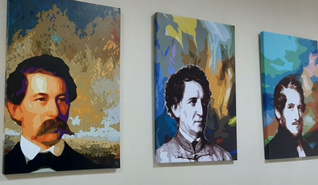 A digitális képek a már közismert portrék alapján készültek, mégis egészen egyedi alkotásokként ékeskednek most az egyetem falán. Valamennyi képen a portré személyéhez kötődik a domináló szín. Kossuth Lajos hátterének vöröse például a háborút, a küzdelmet, a vért szimbolizálja. Arany János sárgája, mondhatni aranya, a ragyogásra utal, ami az ő gondolataiból származik, és egyben eltéveszthetetlen szójáték is a családnevével. Jókai Mór zöldje pedig azt a reményt fejezi ki, amely számos regényében megjelenik.