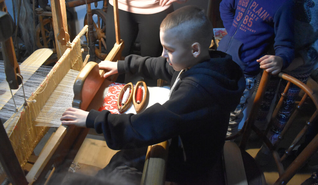 A tájház kamrájában a fonal megmunkálásának folyamatáról hallhattak előadást, majd pedig a szövéssel ismerkedtek. A csoport kipróbálhatta a szövőszéken való munkát.