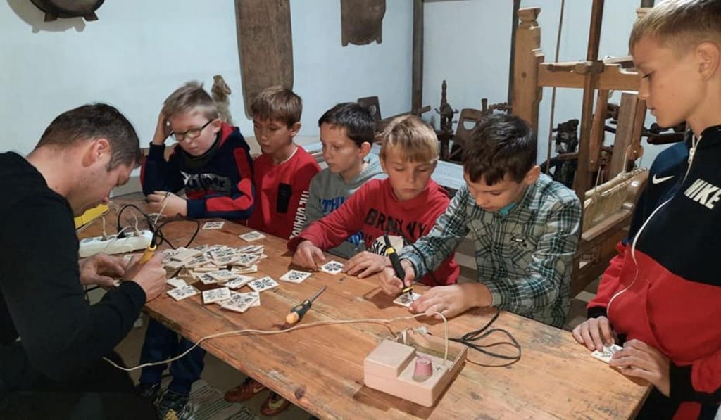 A tájházi sétát követően kezdődhetett az alkotómunka. A foglalkoztató teremben labdákat készítettek nemezből. Furman Éva kézműves segítségével mindenki megbirkózott a feladattal. Az egyszerűen elkészíthető gömbök sikerélményt nyújtottak a gyerekeknek. A tájház kamrájában a fadíszítést próbálhatták ki. Somi István felügyelete mellett beregi motívumokkal mintázott kulcstartókat készítettek a csoport tagjai pirográf technikával.