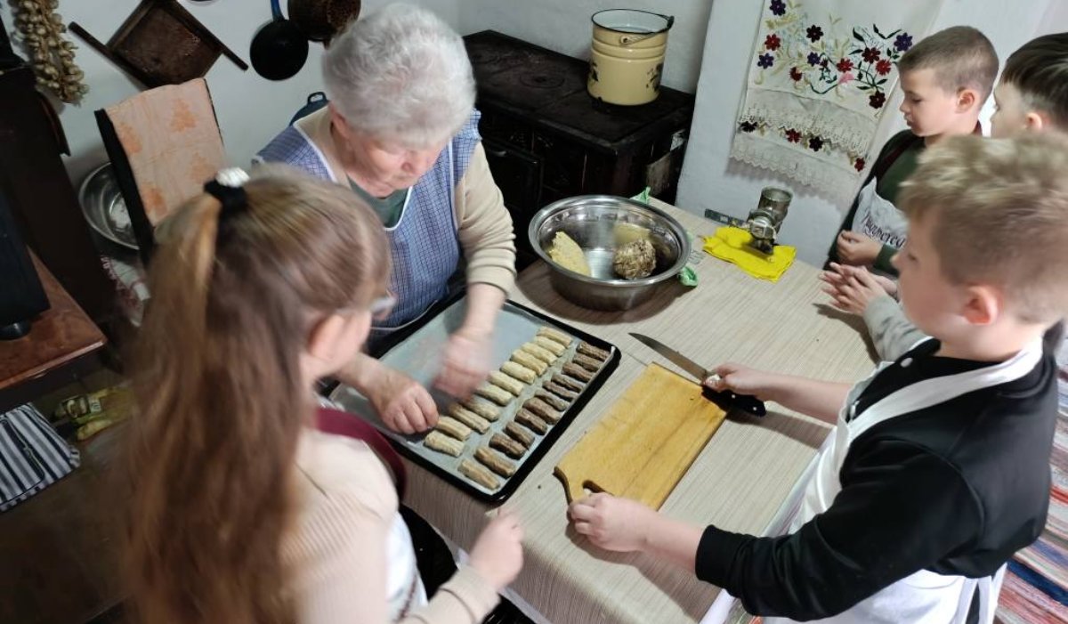 A konyhában felváltva, négyes csoportokban dolgoztak, és darált keksz készült. Az előre elkészített tésztát a gyerekek maguk darálták és vágták apróbb darabokra, majd rakták a tepsibe. A foglalkozás végén közösen fogyasztották el az édességet.