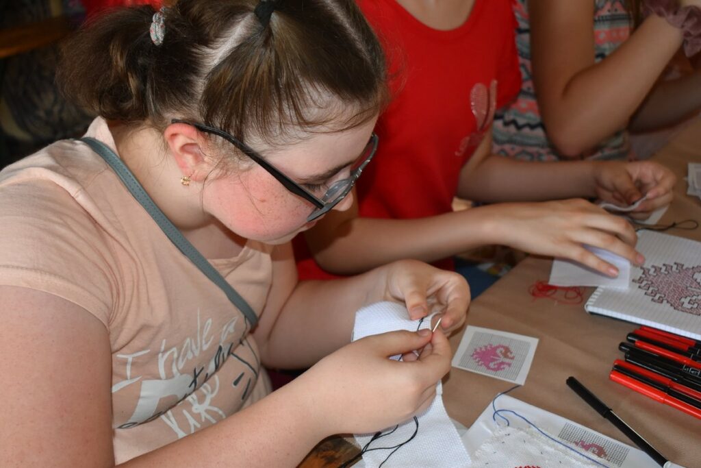 A nagy meleg ellenére szép számmal gyűltek össze a látogatók. A program elején tartott rövid köszöntőt követően a tájház udvarán és a belső terekben párhuzamosan tartották a foglalkozásokat. A kamrában felállított szövőszéken a farkasnyomos minte szedését, szövését tanulták a résztvevők Mester Baksa Andrea tanár, kézműves vezetésével. Ugyanazon mintát keresztszemes hímzéssel készíthették el kint a csűrben felállított stand mellett Furman Éva kézműves oktató, tanár vezetésével. A minták készítése során az oktatók a szövés és varrás technikája mellett beszéltek a beregi szőttes mintakincséről, díszítéséről, és megismertették a farkasnyomos minta legendáját is.
