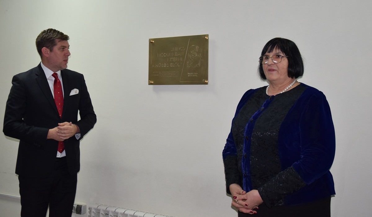 Tamási Áron emléktábláját dr. Szilágyi Péter, helyettes államtitkár és Orosz Ildikó, a Rákóczi-főiskola elnöke leplezte le.