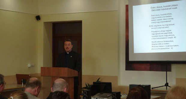 A rendezvény második felében Popovics Béla történész, zenetanár tartotta meg előadását Szemelvények az egyházi zene kialakulásáról címmel, amely nagy hatást gyakorolt a jelenlévőkre, hiszen előadásában nemcsak a zenetörténettel kapcsolatos eseményekkel keltette fel a jelenlévők figyelmét, hanem hitelesen tanúságot tett hitéről is, hangsúlyozva: a szakrális zene mindig élni fog, mert az ember nem tud Isten nélkül élni.