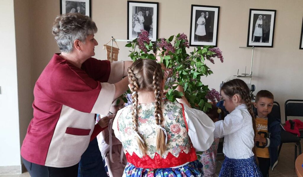 A program a májusfa feldíszítésével kezdődött. Miközben Nagy Anikó útmutatásával masnik készültek a színes szalagokból, a gyerekek a május első éjszakájához kapcsolódó magyar népszokásokról is sok mindent megtudhattak. Azt például, hogy néhány évtizeddel ezelőtt az édesség ajándékozása még nem volt divat, a hajadonok virágzó fa- vagy orgonaágat, esetleg virágcsokrot kaptak attól a legénytől, aki ki akarta fejezni a rokonszenvét vagy a szerelmét. Ugyanakkor a fiúk nemcsak a tetszésüket nyilvánították ki ezen az éjszakán: a rossz hírű lányok lyukas fazékkal, rongyokkal teleaggatott ágat találtak reggel a tornácon.