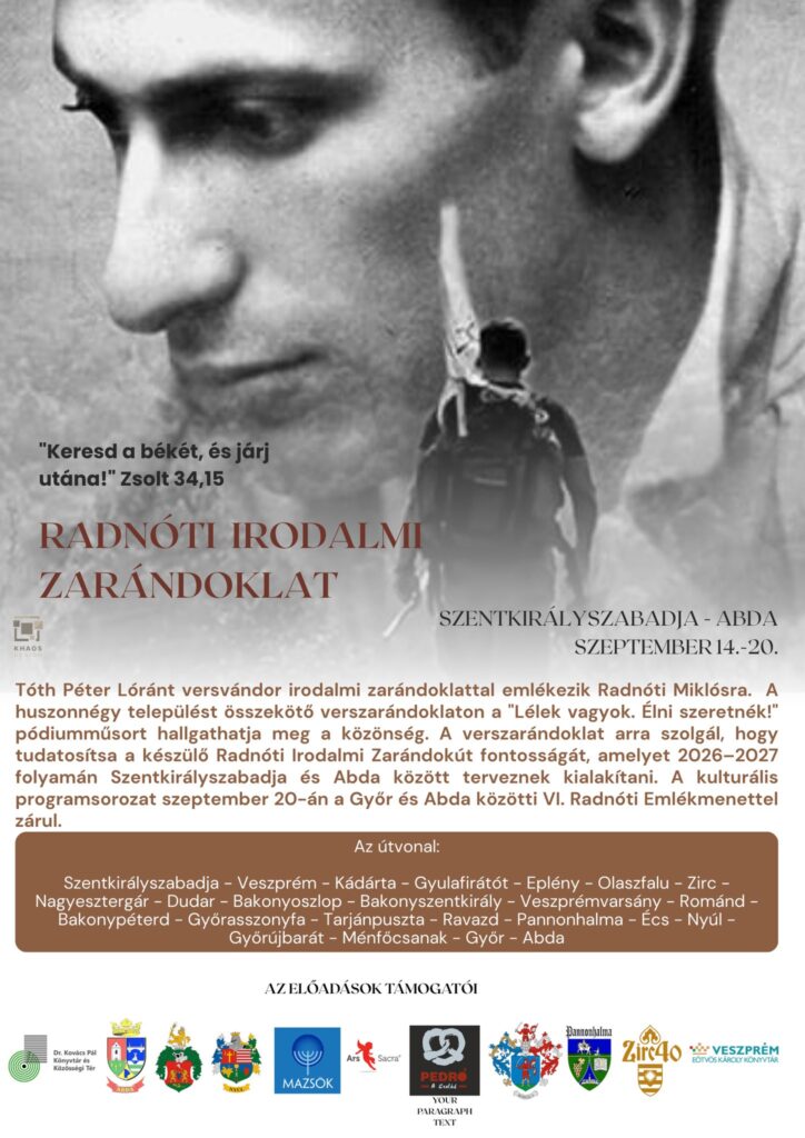Tóth Péter Lóránt kunszentmiklósi versvándor, akit fellépései által a kárpátaljai közönség is ismer, irodalmi zarándoklattal emlékezik Radnóti Miklósra. A huszonnégy magyarországi települést összekötő emlékmenet szeptember 14-én indult Szentkirályszabadjáról.