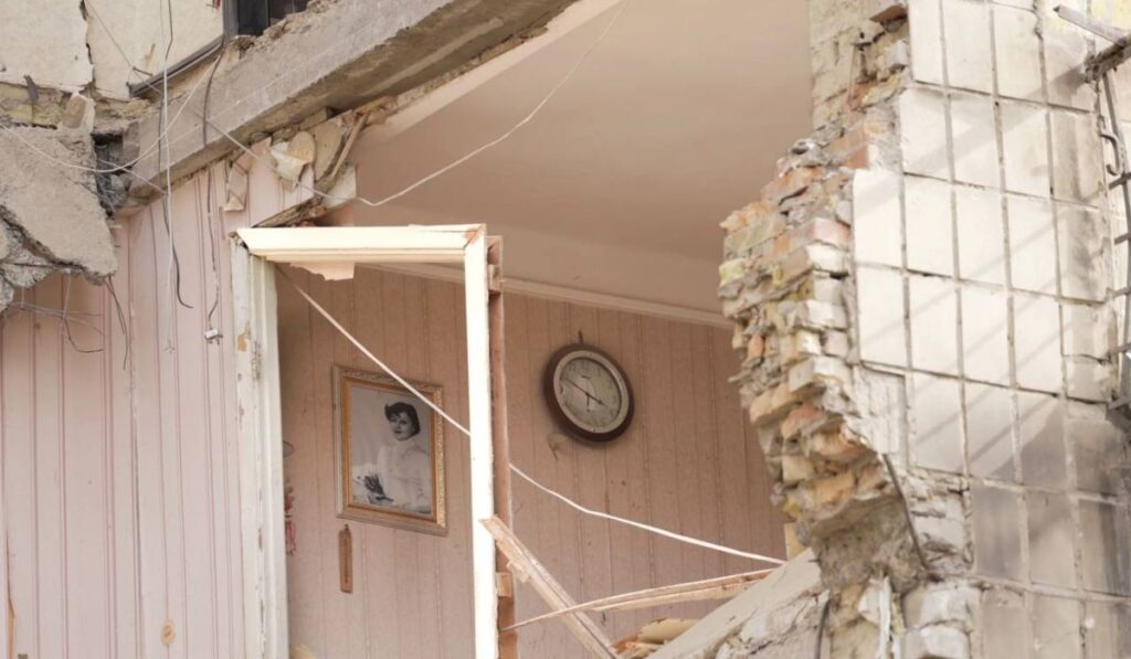 A fotó a június 17-i kijevi támadás után készült. Egy kilencemeletes lakóház teljes lépcsőháza omlott össze a ballisztikus rakétatalálat következtében.
