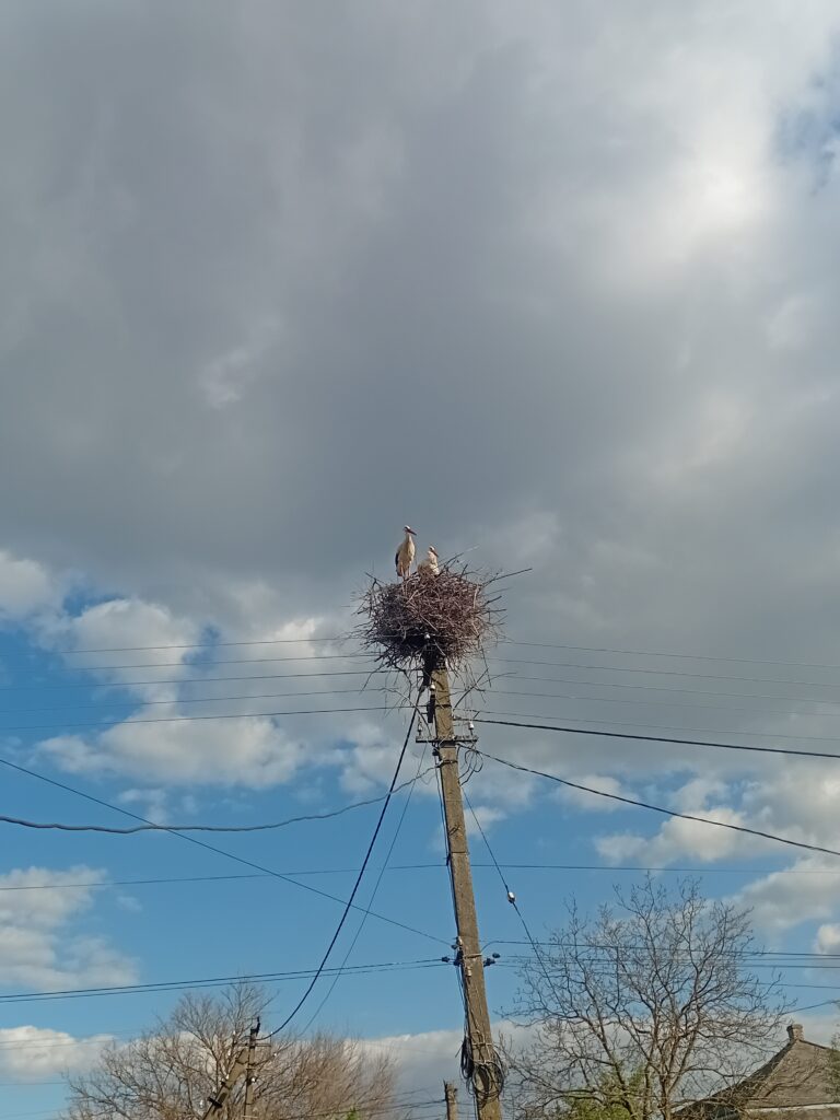 Két gólya büszkén néz, örül, hogy fészke végre kész… Fészkük most már a biztonság, és mindég haza vár! A magas nekik biztonság, ott veszély sose jár.