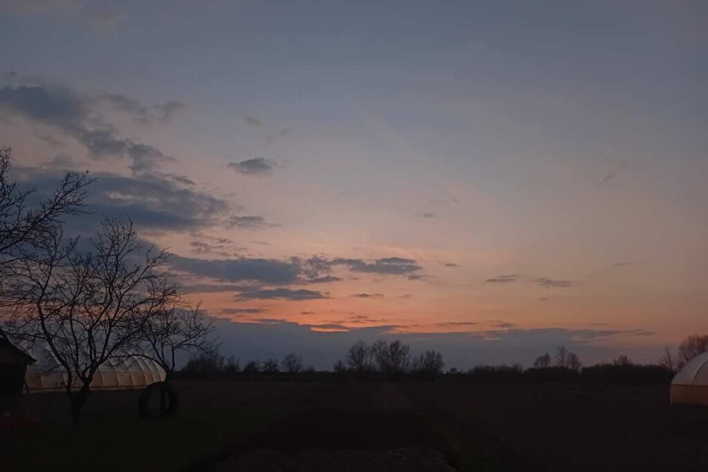 Csendes naplemente egy vidéki mező felett, ahol a narancsos égbolt alatt fák körvonalai és fóliasátrak rajzolódnak ki.