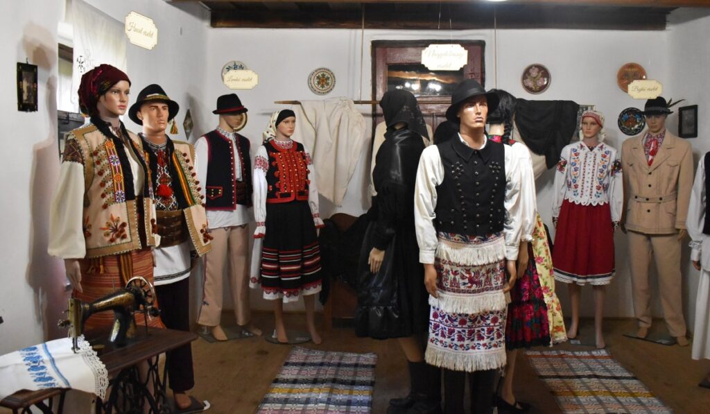 A fotó a Nagyberegi Tájházban bemutatott viseletkiállításon készült. A tájház foglalkoztató termében tizenhét viselet mutatja be a vidék népeinek, népcsoportjainak öltözetét. A kiállítás két héten keresztül látogatható.