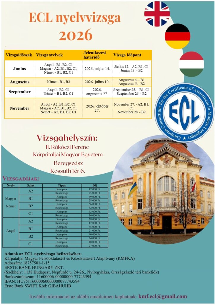 A II. Rákóczi Ferenc Kárpátaljai Magyar Egyetem ECL Nyelvvizsgaközpontja 2026-ban is lehetőséget biztosít nyelvvizsga bizonyítvány megszerzésére angol, német, magyar nyelvből A2, B1, B2, C1 szinteken.