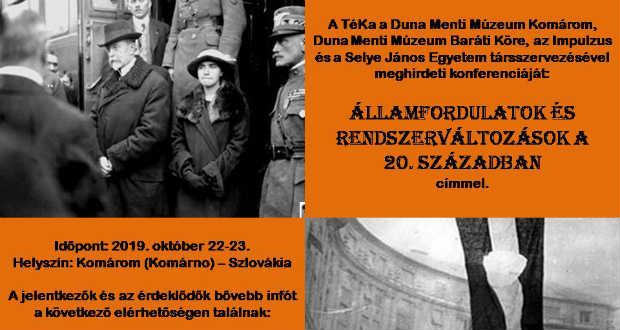 A TéKa a Duna Menti Múzeum Baráti Köre, az Impulzus és a Selye János Egyetem társszervezésével ismét megrendezi nemzetközi tudományos konferenciáját Államfordulatok és rendszerváltozások a 20. században címmel.