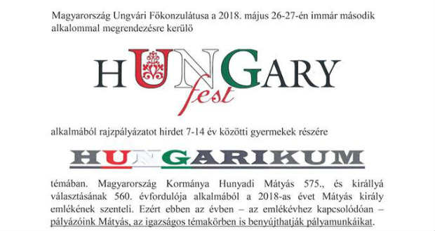 Magyarország Ungvári Főkonzulátusa a 2018. május 26-27-én immár második alkalommal megrendezésre kerülő HUNGARY-FEST alkalmából rajzpályázatot hirdet 7-14 év közötti gyermekek részére Hungarikum témában.