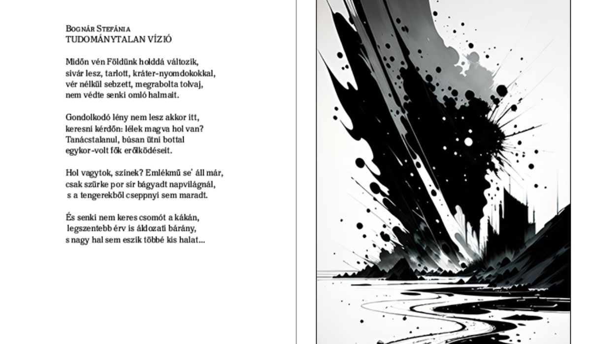 A kötetben minden vers a páratlan oldalon helyezkedik majd el, s mellette a páros oldalon, egy teljes oldalas, a vershez készített szürkeárnyalatos illusztráció, amit a mesterséges intelligenciával hozunk létre.