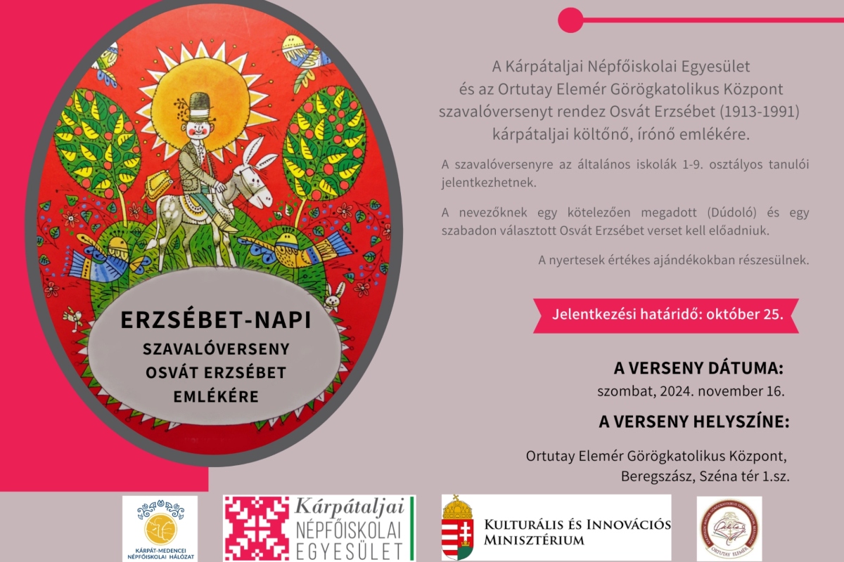 A Kárpátaljai Népfőiskolai Egyesület és az Ortutay Elemér Görögkatolikus Központ szavalóversenyt hirdet Osvát Erzsébet (1913-1991), kárpátaljai költőnő és írónő emlékére. Ezzel az eseménnyel szeretnénk felhívni a figyelmet Osvát Erzsébet életművére és gazdag költészetére, miközben lehetőséget adunk a fiataloknak, hogy megmutassák tehetségüket.