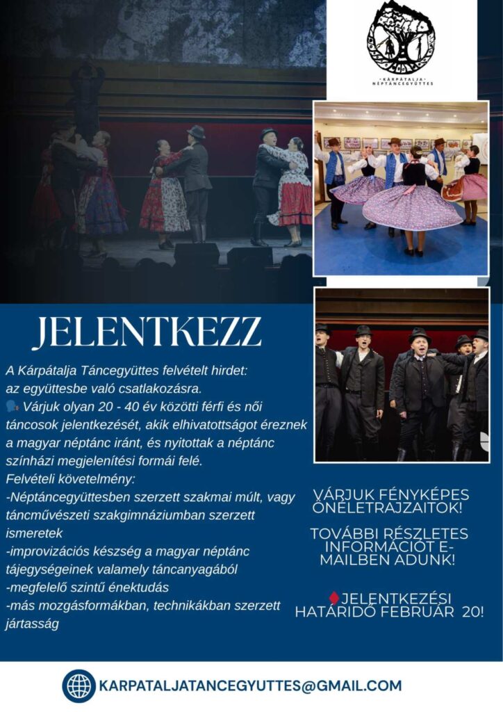 Felvételt hirdet a Kárpátalja Táncegyüttes: az együttes 20–40 év közötti férfi és női táncosok jelentkezését várja, akik elhivatottságot éreznek a magyar néptánc iránt, és nyitottak a néptánc színházi megjelenítési formái felé.