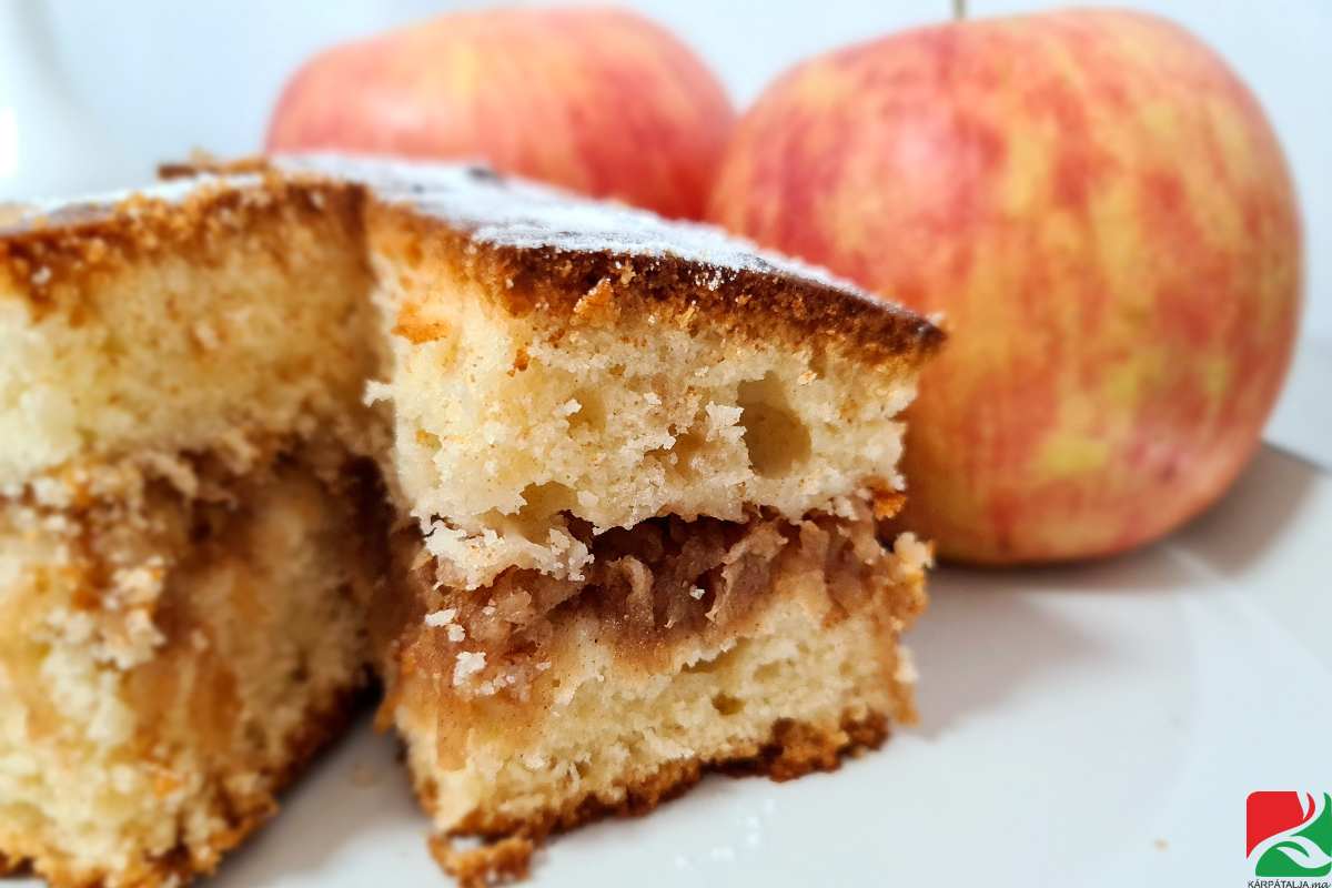 - Egy kb. 25×35 cm-es tepsit kivajazunk és lisztezünk. A tészta felét beleöntjük, majd ráhelyezzük az almás réteget. Végül a tészta másik felével lefedjük az almát.