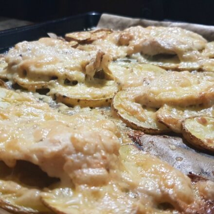 - A burgonyát alaposan megmossuk és felkarikázzuk. Egy tepsit kikenünk olívaolajjal, majd rásorakoztatjuk a burgonyaszeleteket.