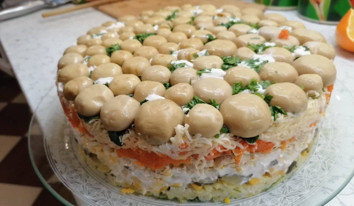 A champignon (csiperke) gomba savanyított változata nagyon közkedvelt a szláv gasztronómiában. Nálunk, Kárpátalján a konzervált gombát könnyen be lehet szerezni az élelmiszerboltok polcairól, ezért a gombasaláta elkészítése nagyon egyszerű folyamat. A recept elkészítése egy kissé időigényes, de egyáltalán nem nehéz, és íze többszörösen kárpótol a ráfordított időért.