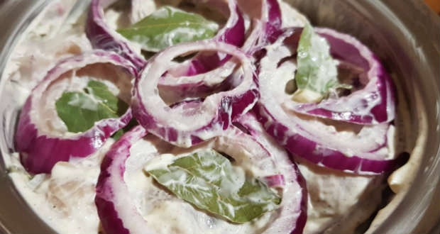 - Ízlés szerint sóval és borssal fűszerezzük, majd rátesszük a majonézt, egy kevés ecetet, 3-4 darab babérlevelet és a hagymakarikák felét.