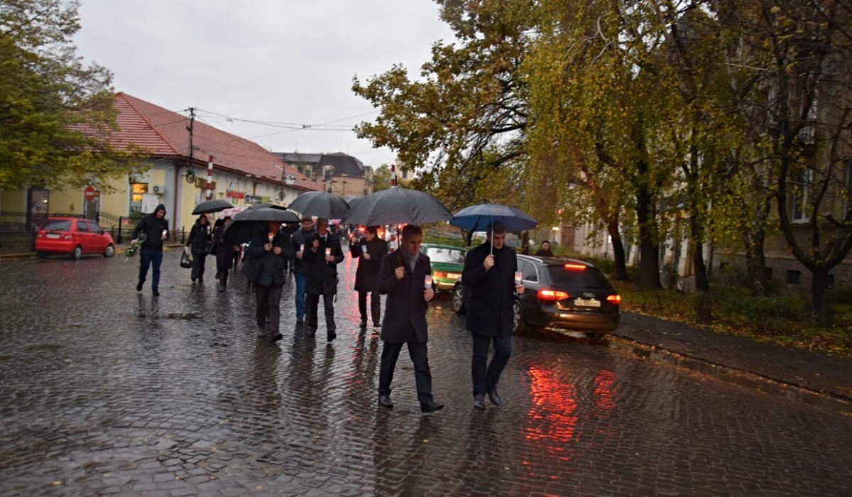 Then the participants marched through the city with candles and laid wreaths at the memorial plaque at the entrance to the Taras Shevchenko Lyceum in Berehove and at the memorial on Széna Square.