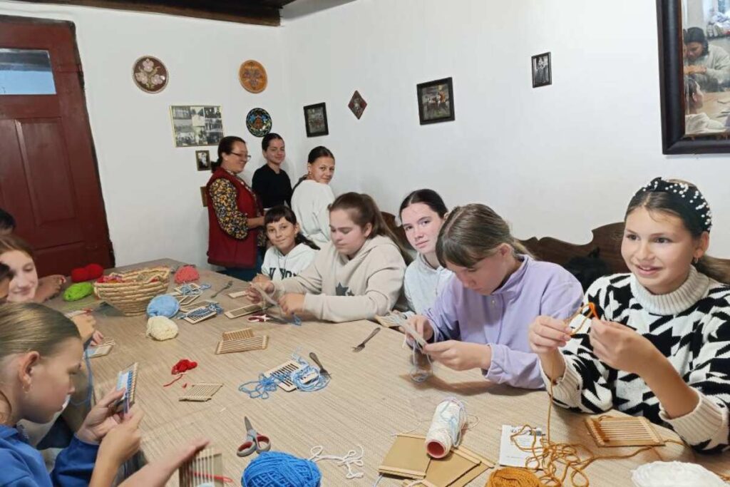 Після екскурсії робота продовжилася у майстерні та біля ткацького верстата. У великій залі під керівництвом Андреї Кепіч учні вчилися ткати на рамці. І хлопці, і дівчата взяли в руки голку та почали проводити нитки. Хтось зробив серветку з візерунком, хтось просту закладку для книжки, але ткали всі. Дехто виготовив навіть браслети.