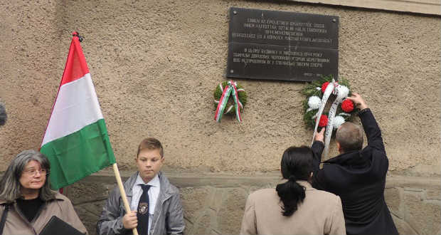 Після богослужінь громада разом вирушила до меморіальної дошки на стіні, яка колись слугувала місцем зборів. Тут політичний секретар та голова відділу зв’язків з громадськістю Закарпатського угорського культурного товариства («KMKSZ») Кароліна Дорчі висловила свою промову, побудовану на основі спогадів людей, які пережили ті страшні часи. В кінці 1944-го, після того, як притихли постріли гармат, війна не закінчилася. За принципом спільної вини на угорське та німецьке населення чекали депортації, репресії, робочі табори. Пані Дорчі наголосила, що нема такої закарпатської угорської родини, де б ніхто не постраждав від системи. Однак протягом десятиліть говорити про ці жахливі події було заборонено. Ми навіть і уявити собі не можемо, через що довелося пройти нашим предкам.