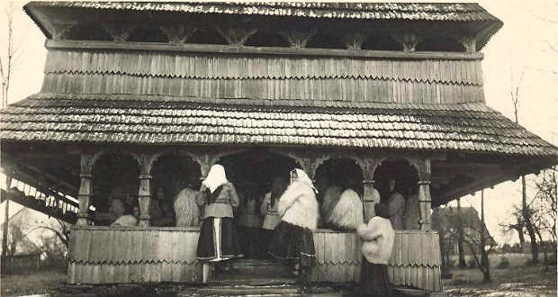 A régi felvételen ruszin asszonyok állnak a templom tornácában, míg bent szertartást végeznek.