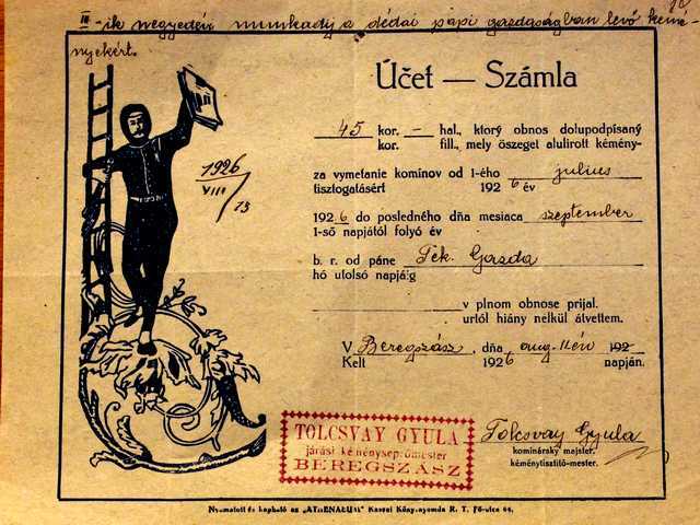 Egy 1926-ból származó nyugta akadt a kezembe, melyen Tolcsvay Gyula beregszászi járási kéményseprő igazolja, hogy a Munkácsi Görögkatolikus Egyházmegye dédai (Beregdéda – a szerk.) papi gazdaságában végzett kéményseprői munkájáért átvette a fizetséget.