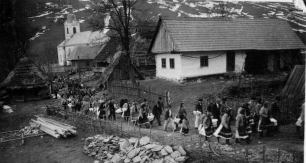 A Nagybereznai járásban, Hajasdon készült az 1930-as években az a felvétel, amelyen épp a pászkás kosarakat hozzák a templomból a szentelést követően a családok.