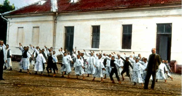 Kárpátalján készítette J. Novotny 1919 és 1925 között azt a fotót, mely mezítlábas, buggyos gatyában tornázó gyerekeket mutat be.