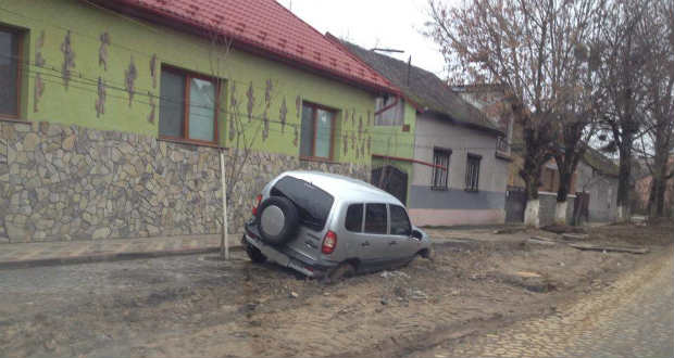 Az utakon nagyméretű árkokat ástak, melyekbe csöveket raktak le. A munkálatok végeztével betemették a mélyedéseket, de sajnos sok helyen megmaradt a sár. Így történhetett meg az is, hogy az Ivan Franko utcán ma beragadt a sárba egy autó két oldalsó kereke.