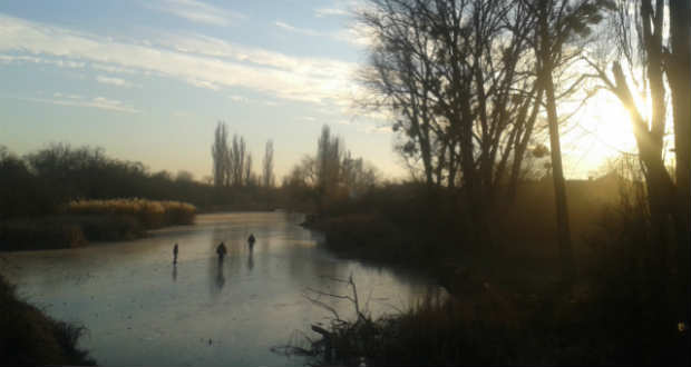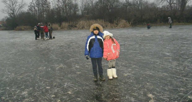 A környékbeli gyerekek korcsolyáznak, csúszkálnak, hokiznak, és még bicikliznek is a jégen.