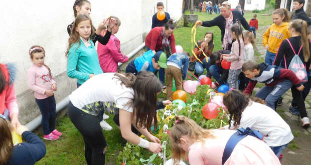 A májusfát iskolás gyermekek díszítették fel, akik kézműves foglalkozásra érkeztek a tájházba.