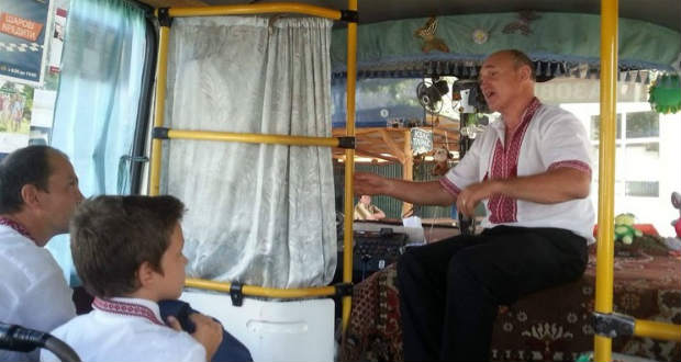 Az autóbusz vezetője ukrán népviseletbe öltözve üdvözölte az utasokat az ünnep alkalmából, és humoros történeteket olvasott fel, valamint édességgel kínálta utasait.
