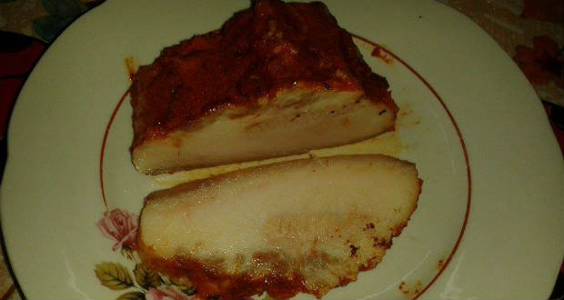 A langyos szalonnát bekenjük paprikakrémmel és reszelt fokhagymával.